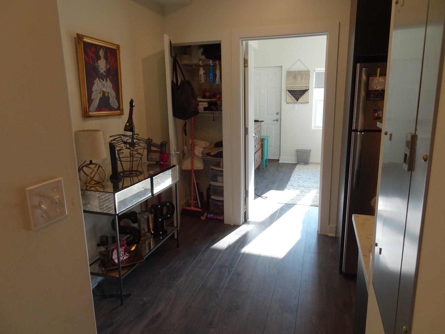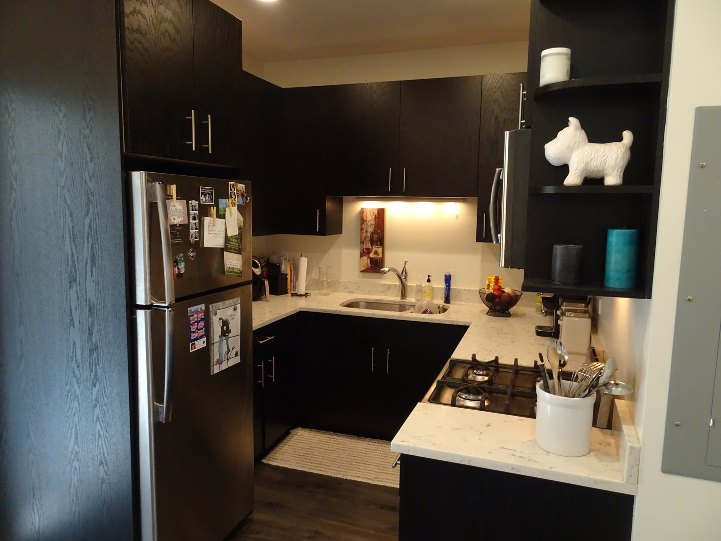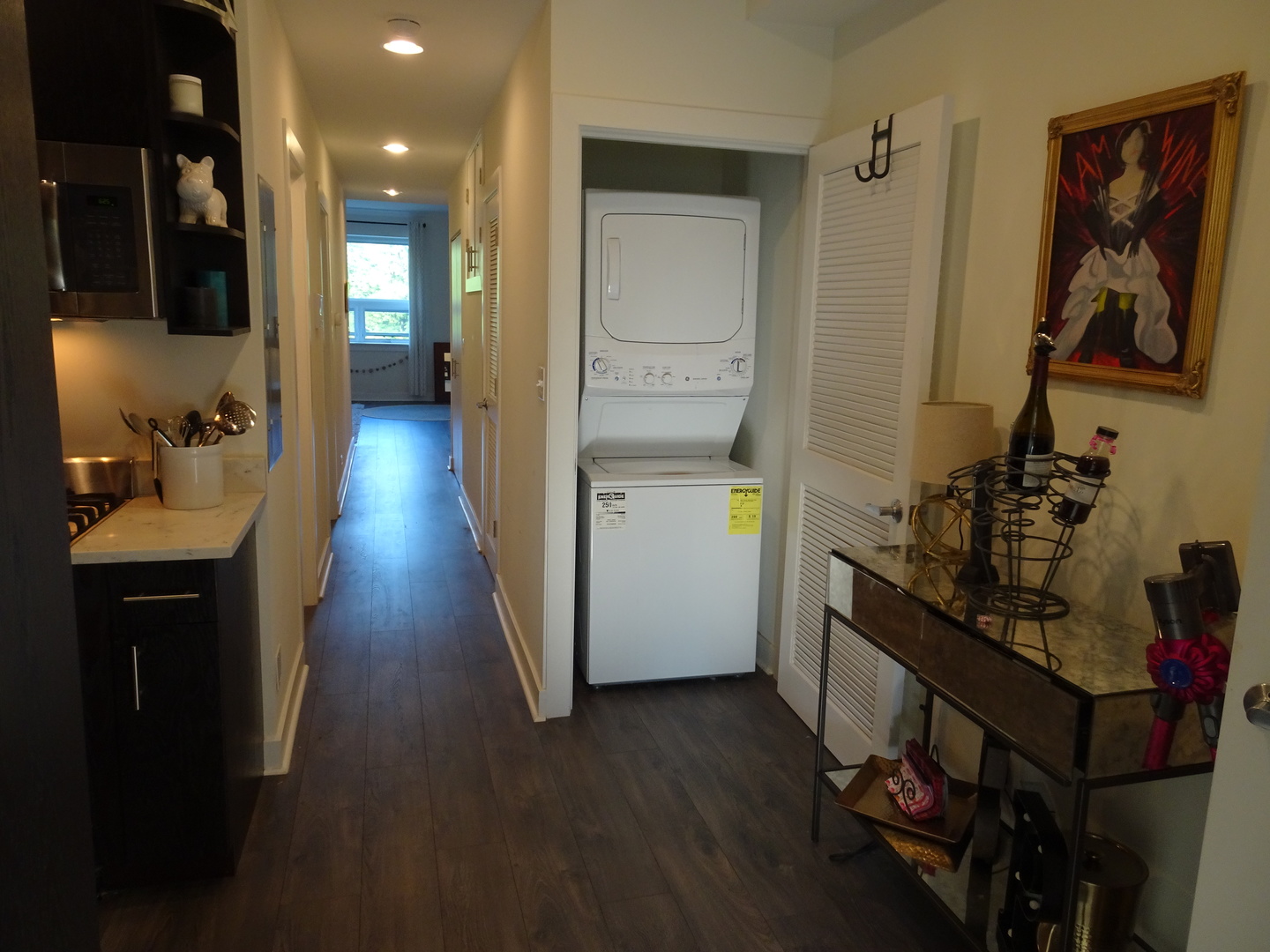 This unit has central heat and A/C, marble countertops in kitchen and bathroom, brushed grey laminate hardwood flooring throughout, Italian porcelain tile in the bathroom, high-end stainless steel GE and Bosch appliances (including dishwasher and built-in microwave) and Kohler plumbing fixtures. The unit has ample closet space and in-unit washer/dryer.